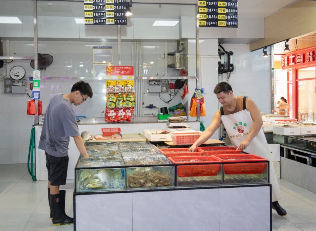 升级改造后的社岗综合市场实施科学分区管理,严格划分生熟、干湿、鲜活经营区域;全面升级外立面、墙体地面、通风排水等硬件设施;此外,市场还增设40台空调,成为虎门镇首个全空调覆盖的农贸市场,显著提升购物舒适度。